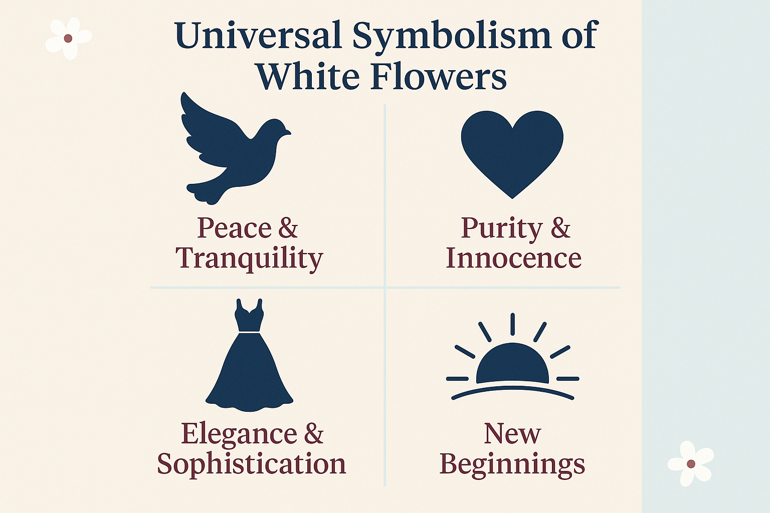 • White flowers universally symbolize purity, innocence, peace, and new beginnings across most cultures and traditions