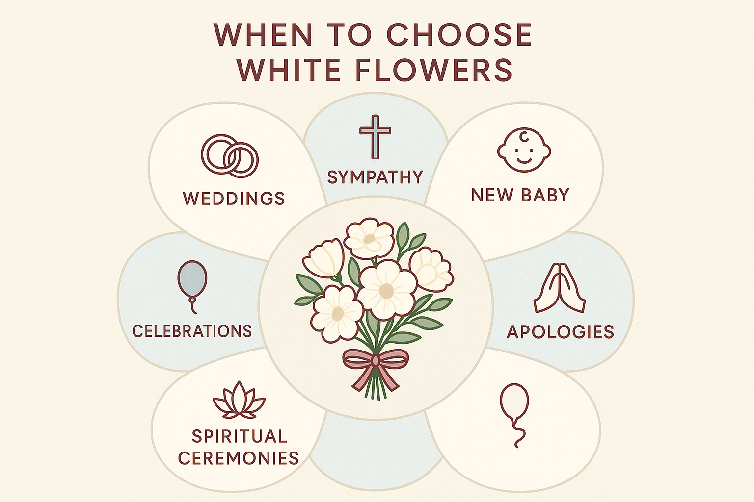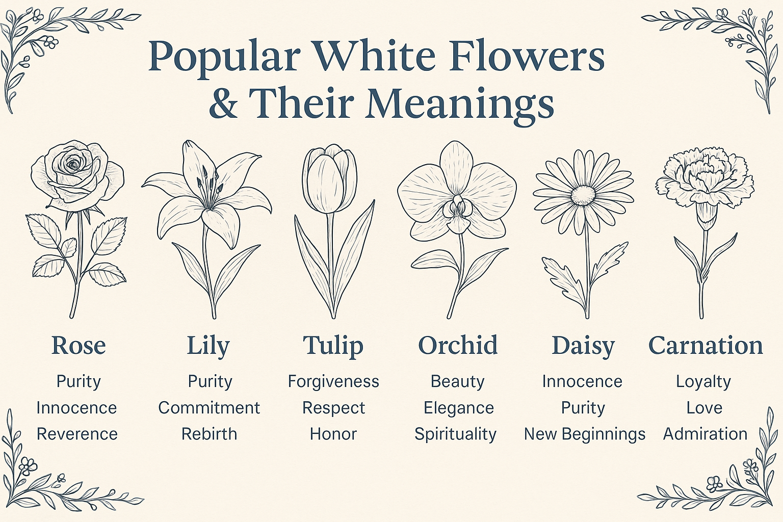 • Different white flowers carry unique meanings—roses represent reverence and honor, lilies symbolize rebirth, and orchids convey elegance and luxury